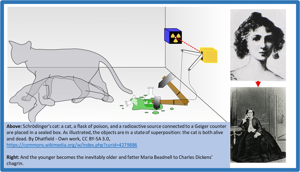 And, in particular interactions between time and control in one’s own self-interest are energised around issues of holding on or letting go in close relationships (whether to dump or not). They are felt in the need to feel one is progressing and not being held back but also by those who do want to hold on or possess for time seems their enemy. The funniest version of their sometime simultaneous occasion is in the telling of the story of Dickens decision that the only person he had ever loved was Maria Beadnell. When he learns that for her fullness of time meant fullness of body – she has grown fat – Dickens can’t dump her fast enough (I have a feeling that might have happened just so for me – LOL, though I never was a Beadnell).[17] Th most philosophically central illustration is the recurrence in the story of the thought experiment of Schrodinger’s cat from quantum mechanics.