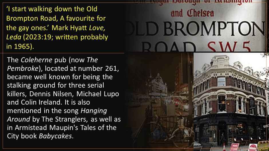 But I wonder anyway if how queer people DEFINE themselves, which often turns upon a labelling term is the issue for queer lives, people, and interactions in quotidian existence. The word ‘gay’ is used as an adjective and noun in this novel in ways we, of course, would recognise though we might miss some of its limiting nuance for it is unlikely when Leda walks down Old Brompton Road, probably to the then Coleherne pub (though it is not mentioned by name), they identify with the ‘gay ones’.