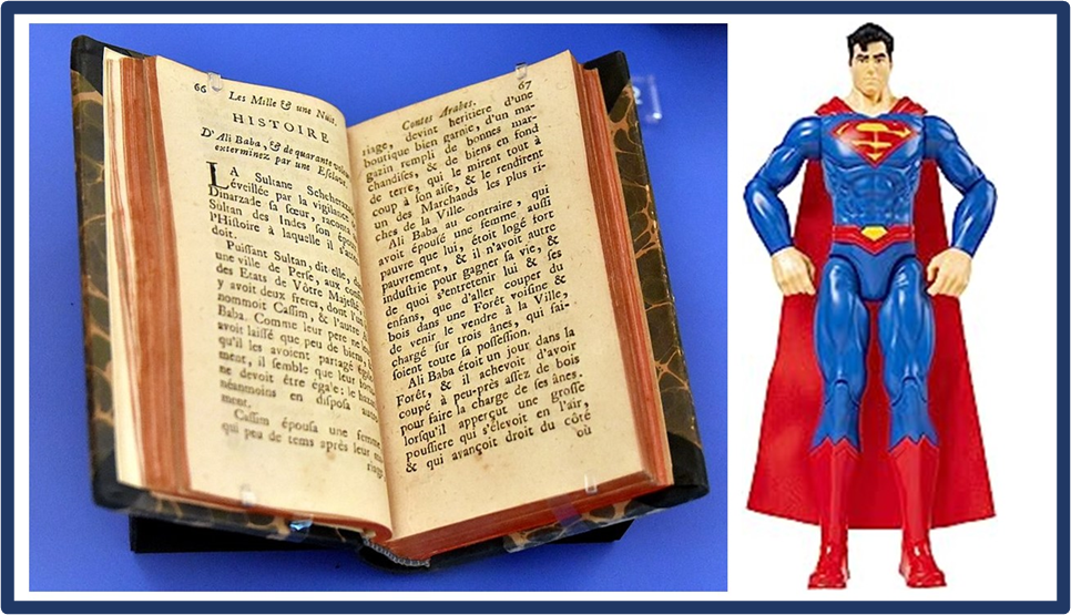 The first European edition of The Arabian Nights By Osama Shukir Muhammed Amin FRCP(Glasg) – Own work, CC BY-SA 4.0, in https://commons.wikimedia.org/w/index.php?curid=92800765 (it was in French) & Superman toy.