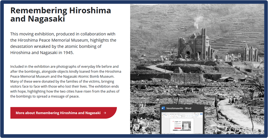 The exhibition shows devastation too in small details – such as a child’s lunch box which has been melted and reformed by the cooling after the blast, but where the food contents have now congealed with the metal. In one of the survivor stories, a man who was 14 at the time speaks of the bombing of his school. In his class most were buried by falling masonry although some were saved by solid furniture. The boys in his class of 45 initially had ten survivors and these boys sang the school song loudly in the hope of rescue. By the time help came there was only one voice left singing, the man who weeps through the telling of that story. And there are others as horrific.