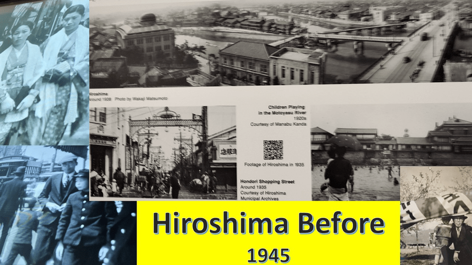 Seeing an exhibition like the one currently on at the Oriental Museum at Durham feels like a duty and I can’t say that it is an enjoyable experience. It is however a necessary one particularly after seeing Christopher Nolan’s film Oppenheimer recently (see my blog on that from the link). It is a great film but, by necessity, it concentrates on the life of the inventor of the atom bomb – exploring all aspects of what it means to invent a power so formidable bound up with th power released by nuclear fission, but not particularly looking at the immediate consequences of its early deployment. Hence, seeing this exhibition brings home some truths. It may be best if I just show the evidence for what kind of exhibition this is. The main part is of photographs that show Hiroshima (mainly -though Nagasaki is there) of life in the cities before they became the first sites on which atom bombs were deployed – deployed the exhibition reminded me, showing the part played in Truman’s decision of Winston Churchill, without warning and without certainty about the extent of the consequences. This was surely one of the evillest acts ever perpetrated in human history.