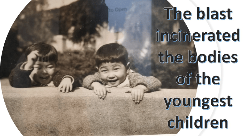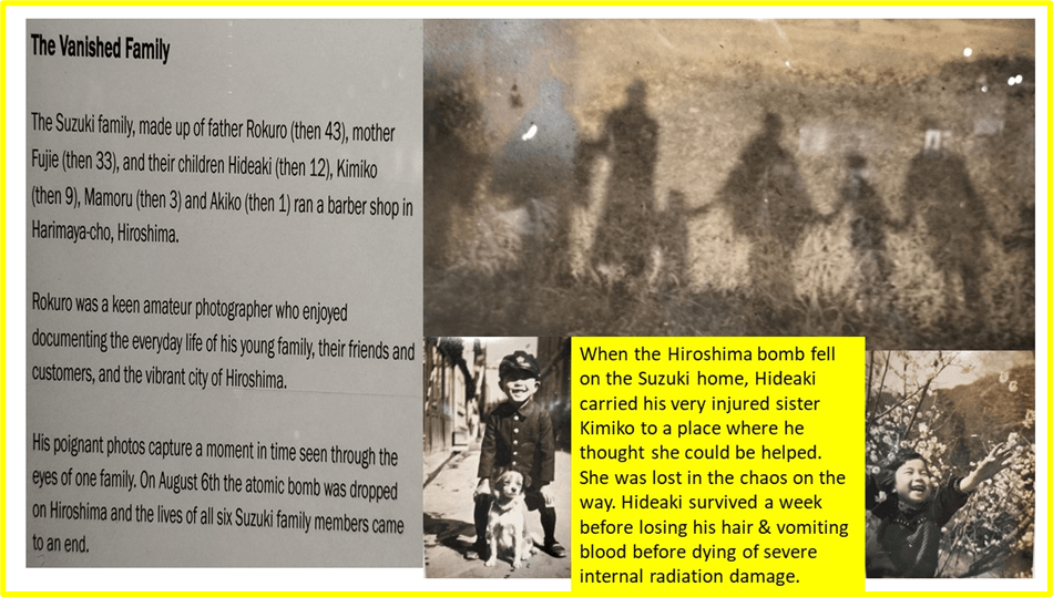 Suzuki fancied himself as a fancy photographer (don’t we all sometimes) and was proud obviously of his innovative camera angles. He was probably especially so of a picture he took of the shadows of his whole family taken from above, although used here under the title The Vanished Family, it is more than eerie and perhaps a little upsetting, for the whole family was lost to the bomb. Not ‘cleanly’ on a first blast leaving only humanly shaped dust (like a shadow) on the ground but over time (though a short time, it could not have felt like it to them) and in fragments.