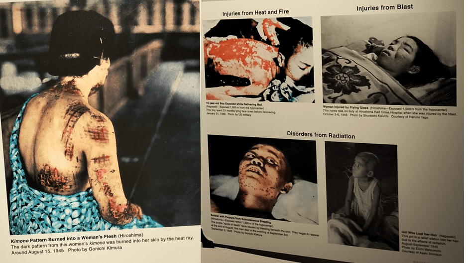Below a woman shows the scars of her silk kimono which burned into her flesh. It is a thing which that wonderful novelist Kamila Shamsie has made a key centre of her early novel, Burnt Shadows, a novel I cannot recommend too much. And in this collage evidence of the other harms over long periods. Terrible! Terrible!
