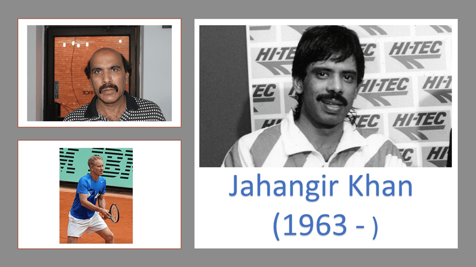 From top left, clockwise, Gogi Alauddin at the 2nd Asian Masters Championship in Lahore, PAK, 2012 by Billynumnum – Camera at the Championship, CC BY-SA 3.0, https://commons.wikimedia.org/w/index.php?curid=21318446; Photograph of Khan from: https://i-love-squash.com/jahangir-khan-celebrates-50th-birthday/ ; John McEnroe at the 2012 French Open – Legends Over 45 Doubles By Pruneau – Own work, CC BY-SA 3.0, https://commons.wikimedia.org/w/index.php?curid=19798261