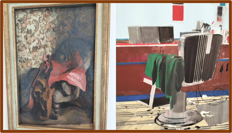 The plaque states the themes I found it useful to pursue, especially around the use of the motif to state concerns about the potentials and limits of painting as a means of expression in the moment and as a tradition with its own internal debates – between abstraction and figuration, minimalism and rich painterly detail, AND mimesis and reflexive self-examination by the media and formal design of the media ad formal design. That Anderson himself references ‘Cubism’ in this piece is important but surely not exhaustive of the rich traditions consulted. Indeed if you were in any doubt about this, it would be eased by the eclectic selection of the paintings that Hurvin Anderson curates in a sub-section of the exhibition, including painters as unlike as Michael Andrews and Francis Bacon, Patrick Caulfield and Leon Kossoff. I thought it interesting to return at different moments to some of this curated work which was presented as an ‘influence’ and therefore might matter to us to help us see the painter freshly but in artistic context. I will start with the most surprising of all to me, which is Duncan Grant (though I love Grant). However, I try in the collage below to make sense of that choice by a comparison, which hopefully helps us to dive a little deeper than just saying both are paintings of a chair across which a fabric item of clothing or cover has been thrown somewhat haphazardly.