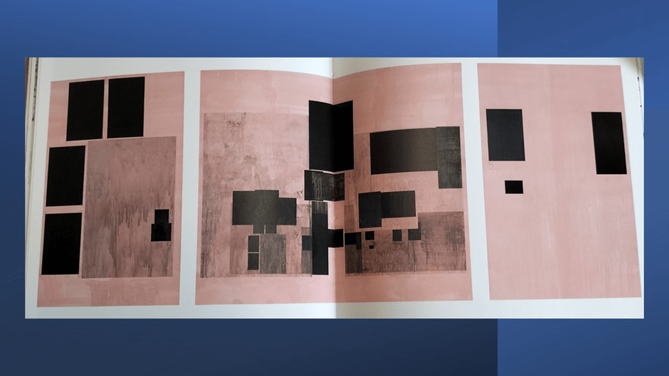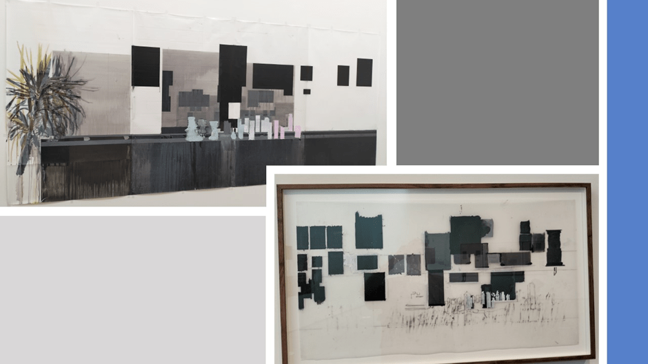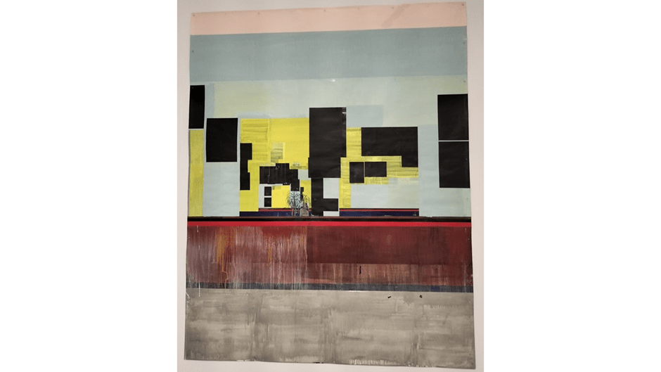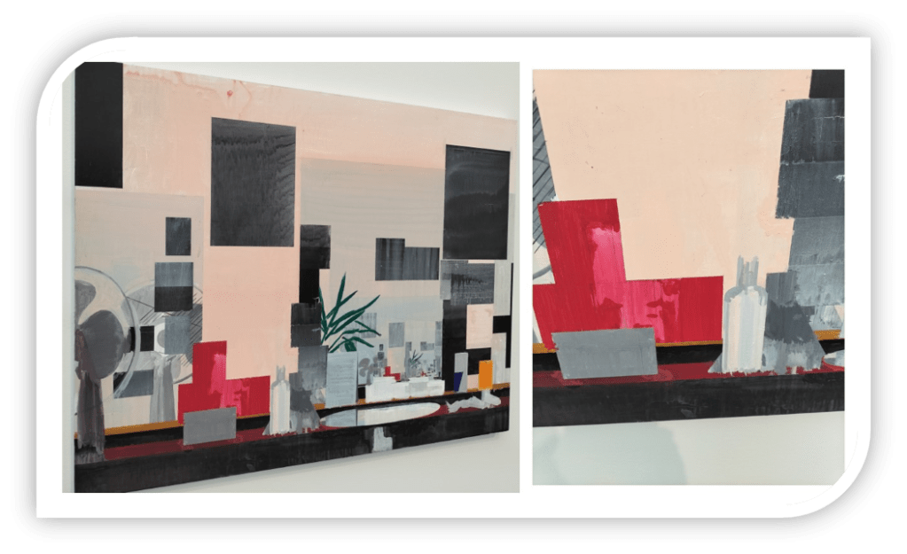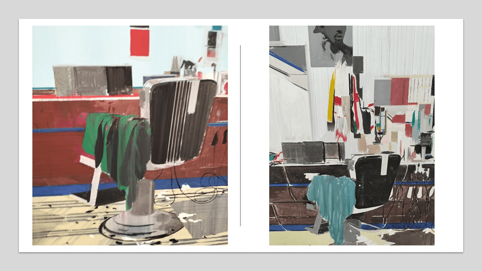 At its coldest are the paintings that reduce the barbershop motif to bare essentials, as in the 2017 paintings (actually named Essentials), where various shades of grey to black rectangles, often shaded by different painterly marking materials (paint or pencil, watercolour or gouache) to be either transparent or opaque in look are located on a wash of pink in three companion paintings.