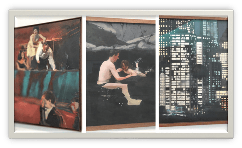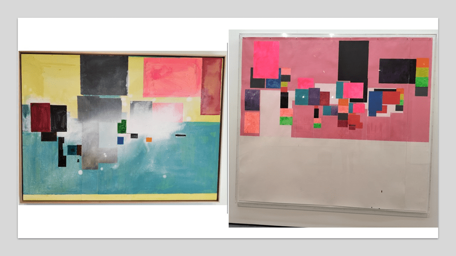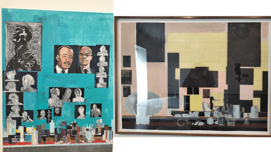 The issue with photographs and wall art raises similar problems to mirrors. Thery raise novel perspectives – including sociocultural politics. Again complexities arise I will evade in comparing in the collage below Is it Ok to be Black? (2016) –right- and a poor reproduction (clearly with reflected glass issues) of Dixie Peach (2020) – left.