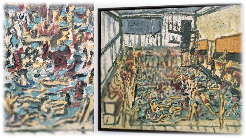 The layering he may have learned from his love of the so-called London school painters including Francis Bacon, Michael Andrews and Leon Kossoff, represented in his curated section of influences: two of which painters I will represent silently below, for I did not study these effects in the gallery on this visit, apart from th obvious uses of layering impasto in Kossoff’s Bathers.