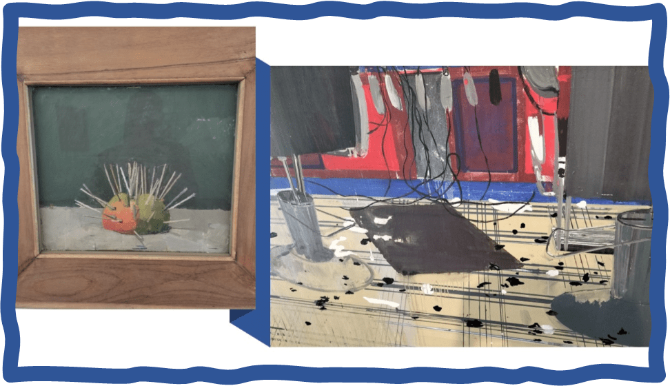 Although there is a similarity of the mise en scène of the 2008 painting Jersey and the 2006 Barbershop, the proxemics – the use of spatial distances between objects and between the viewer and the perspective feels different, sometimes subtly, but at other times, less so. The figure in one of the wall paintings (of a Caribbean male) humanises and creates more give in the 2006 painting which the blue background and non-figurative geometric patters of the wall in Jersey does not. Fabric flows on the counter-top furniture of Barbershop with rich but subtle patter, like the less deep folds of the less careful thrown blue cloth on the chair therein. Even comparing these two pieces of thrown cloth alone is instructive visually as in the detail comparison below.