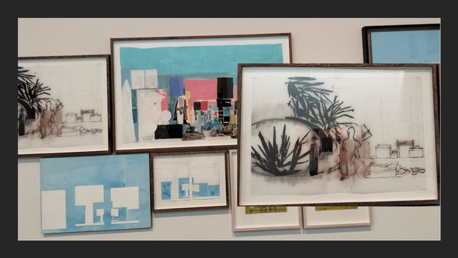 However, we shall see here as elsewhere how Anderson often utilises realistic AND iconic near-stereotyped capture of spiny plant leaves when he addresses this problem. For instance if one compares Studio Drawing 10 (2010) – bottom left in below collage – with the painting in my photograph in the top right (for which I did not take a note of the name nor can I find in the catalogue), the spiny plant in the latter makes all the difference in bringing the viewer in front of troubling mirror spaces – reduced to abstracts to recall their ‘unreality’ – into the painting more easily. But of my feelings here I am uneasy – and so it should be before great painting.