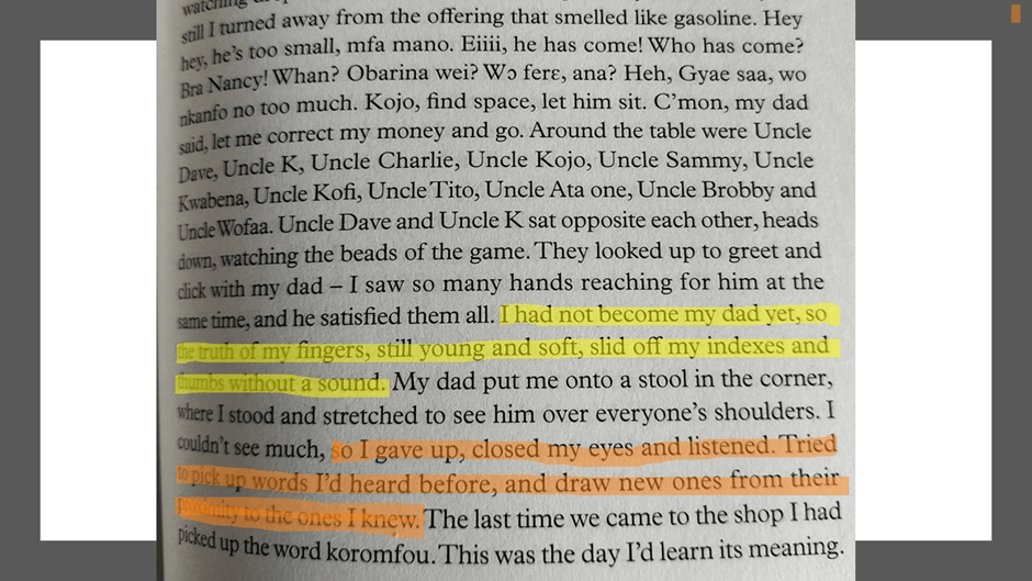 The issues of understanding here are of course those associated with poetry, and of an embodied knowledge, where the names of the body parts still bear something excess of their cognitive content, something of sensation, whilst leaning out to other future cognitive functions, such as those that connect the function of an index finger to indexes through which a books referents can be listed. It is beautiful. It is difficult to see other writers daring this in the way Owusu does. And these issues are deeply locked in specific and perhaps localised cultures – even localised to different London districts or churches or even idiolects established by powerful people in their own community. Owusu’s narrator will claim soon that: