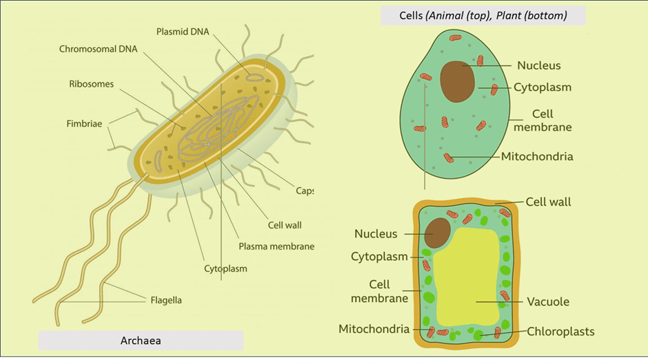 Conceptual pictures of archaea (https://www.allthescience.org/what-are-archaea.htm) and animal and plant cells (https://www.bbc.co.uk/bitesize/topics/znyycdm/articles/zkm7wnb#:~:text=Cells%20are%20the%20smallest%20unit%20of%20life%20and,are%20found%20in%20both%20animal%20and%20plant%20cells).