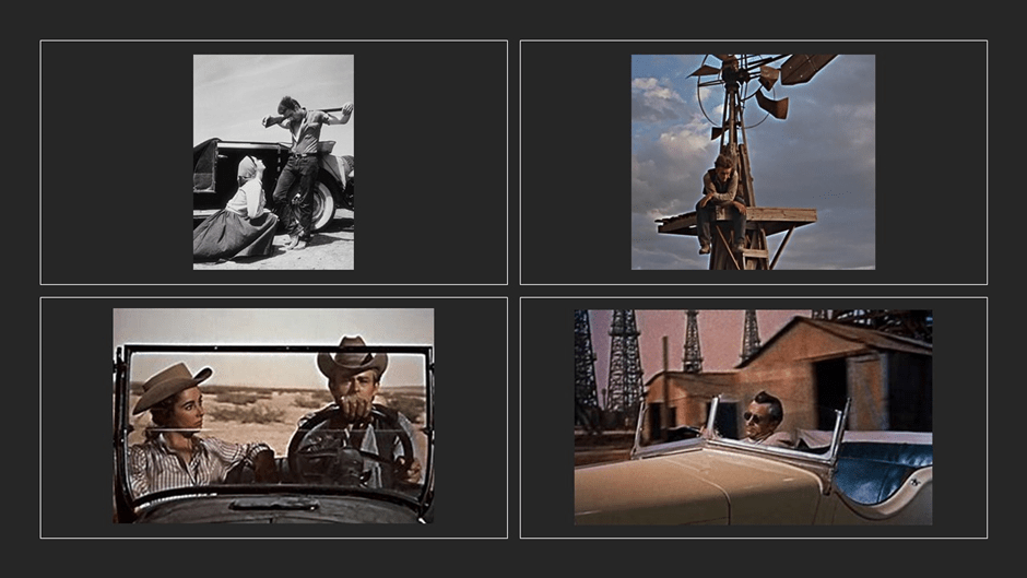 Later in the film, called into the house by Bick – actually to discuss his legacy – Jett petulantly says: ‘Boy, howdy, nobody’s firing me’. Jett, played by James Dean, who Griffin tells us was hated by Rock as much as Bick hates Jett, jeers at Bick with the taunt, ‘just tell me who is boss here’ (for he answers mainly to Luz). When leaving the farm on a task he says: ‘Ain’t nobody that s king in this country’. When Jet’s land strikes an oil gusher, he knows he will be a rich man, makes a pass at Lesley before Bick’s eyes and when challenged in fight describes Bick as ‘Touchy as an old cock’. The masculine size contest could not be clearer, though of course he means a cock-hen, ostensibly.
