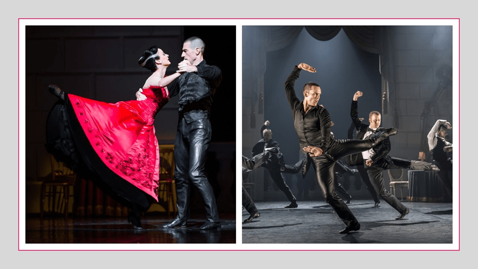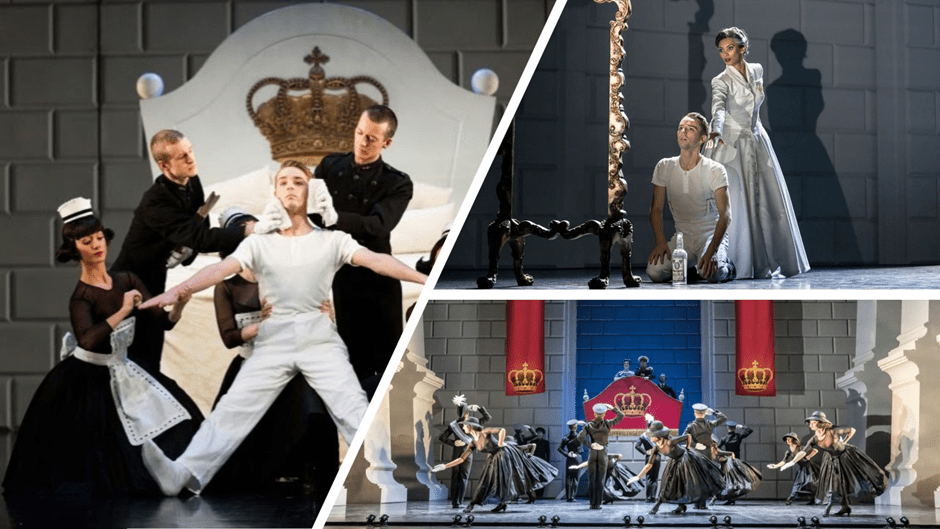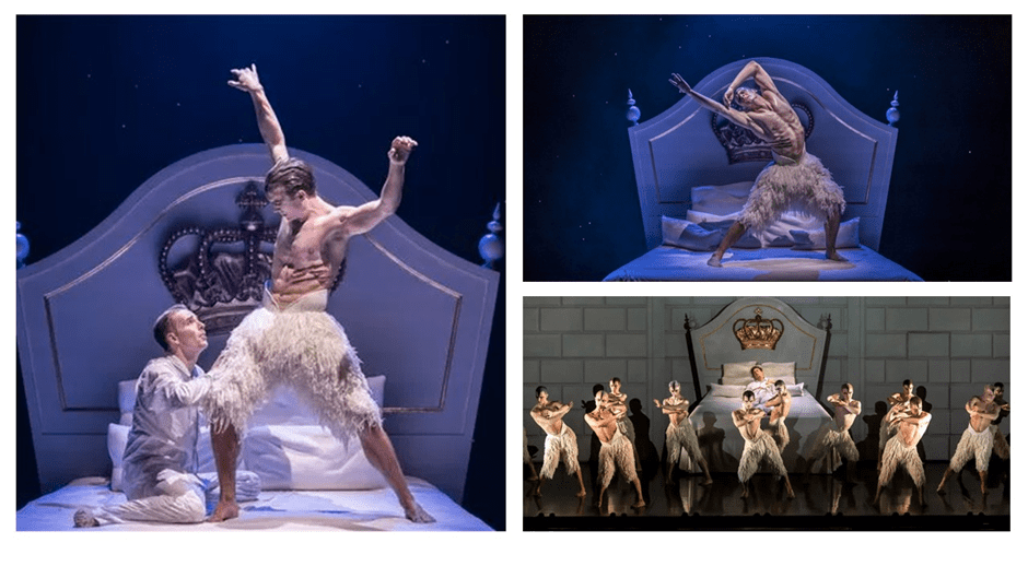 However time presses and, in order to blog on this experience, the only method I could imagine was to walk through my memories of the sequence of the story, which can be found in the Wikipedia entry at this link (It tells the new story at great length). I will use collages of already published pictures from the Internet. Of course these do not always feature the same cast (and that is largely true of the Swan / Stranger dancer, who appears to be Matthew Ball from the 2018 production not Will Bozier) though amongst other principals the Prince and the Queen are danced by the same people, Liam Mower and Nicole Kabera).