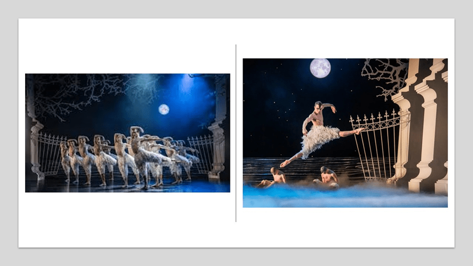 At other times, leg extensions mime these straight lines in flight – not as representations of a swan per se but suggestively. In Act 2, the Swan is supremely confident of his role as the alpha bird of flock, venerated by the corps, who sculpt the space in which they dance with exquisite ordered patterns, as in the conventional productions (like that of Birmingham Ballet in my first blog). These ordered patterns will disappear in Act 4, when the swan corps turn against their leader for queering the boundary between bird and men, and perhaps too the boundary that they feel should exist between male and male as sexually romantic lovers whatever their species. See the picture to the left in the collage below for the patterns, though the aerial pre-eminence of the Swan over the swan corps is more the issue on the picture on the right. Whilst the swan corps when he is there, hide in ground mist, he soars into the represented moonlight.