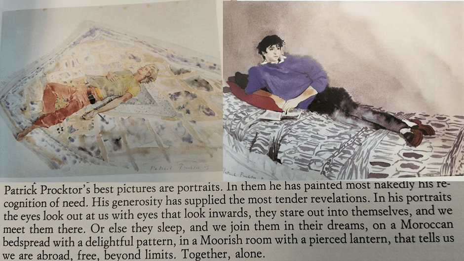 Moreover, the editor’s words in the book makes that approach beautifully appropriate, as a means of attempting to understand the artist, even now he is largely forgotten. That editor, Patrick Kinmonth, is a man who was himself at that time returning to painting after a career the editor of Vogue, and was to become a polymath of the ‘fine arts’: director and designer of opera and ballet, writer and artist. He is also the subject of one of the finest art works in the book. For Kinmouth (and Procktor he insists), facts are not the materials from which truths are told in art. He says, for instance, that an ‘artist chooses and invents all the time’ and that in ‘being a ‘guardian of the deep truth’ the effects of one’s produced art are those of ‘the beautiful lie, opening like a window, painted to reveal’. The progenitor of such ideas is claimed by Kinmonth as Jean Cocteau who said, as Kinmonth cites “I am the lie that tells the truth”.