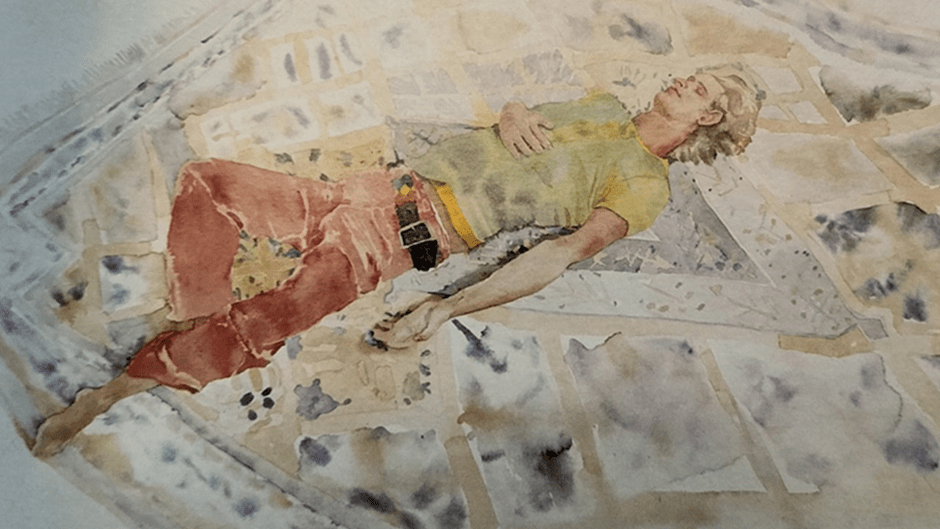 Morocco was considered a safe space for queer men escaping the strictures of homophobic Britain, of which place Procktor was (as we know from Ian Massey’s biography – Ian Massey (2010) ‘Patrick Procktor: Art and Life’ Norwich, Unicorn Press) very familiar, but whether this is part of the queerness that these paintings free from conventions (of the representation and inhabitation of masculine look and feel) I would not want to stress, though I believe it to be the case. And the hands of both models are relaxed and still, paused in rest upon the bed or holding each other in calm meditation. The inwardness is there of course in spades, and in part it justifies the liminality of the outlines of the figure in blurred water paint, especially the purple jumper and the trousers (at least at the thighs) of the figure of Kinmonth in the portrait of him, which is worth looking at in detail (below). In both cases the painter’s brush is active at the men’s thigh and genitals but not in a way that exposes. And again Olé’s Dream when seen whole is a painting where there is so much empty space, as if (in the latte case) the Moroccan bedspread were a flying carpet suspended flatly in that space.