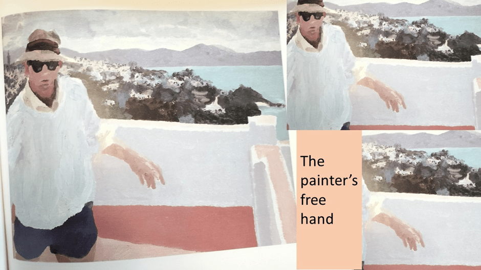 Though I might have used this as a picture of a man at work, what is clear is that though the painter is clearly in the act of painting his model at which he gazes, none of the instruments of his work are made visible, even the hand that is painting. At the centre of the painting is the painter free hand NOT the hand that is bound to its task. Even the eyes with which he observes his subject are obscured by sunglasses. Yet that free feels beautifully expressive, in my eye needy (if a hand can be needy) as if it needed to touch that which it creates to test its solidity.