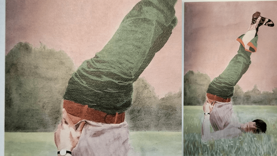 If we need a category for these paintings it may be the man in play, as in this one below of Gervase Griffiths, an aspiring pop-singer and the focus of what Massey calls ‘one of the great love affairs’ of Procktor’s life.[7] The painting of a boyfriend inverted is almost undressing its subject. As a picture of need much might be said of this piece for Griffiths was predominantly heterosexual according to Massey and the relationship was very unbalanced emotionally’.