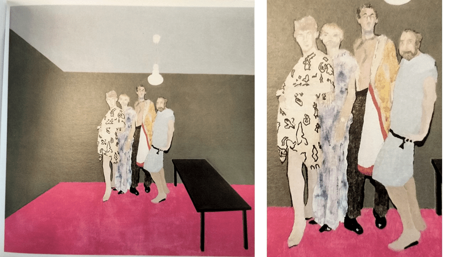 I can’t leave the paintings of men by Procktor in this book without noticing Halloween, which is unlike the rest entirely, and not just for the illusion of three dimensionality of the black table in it which Kinmonth refers to in his essay, but the two -dimensionality of pictured male subjects, four of them, emphasised by the artifice of black outlines to their bodies rarely seen in other paintings. Each of the four men is dressed in fancy dress but three are in drag, presumably for a Halloween party. What exactly is the painting doing though for it s insistently humourless and the blank room with its over regular edges feels as if were intent on draining the life out of its contents, to say nothing of any sense of a party taking place. It recalls Shades, also painted in 1966, now lost but which Massey describes as: