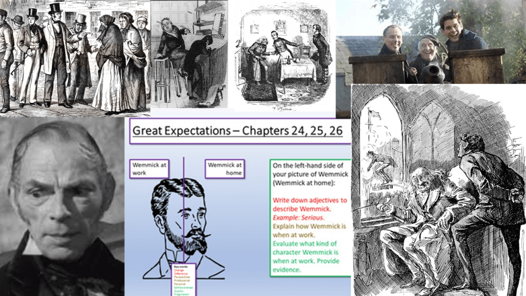 Wemmick has a split personality. At work, he is professional, business-like and can be quite a bully. At home (which is in the form of a miniature castle), he is kind, caring and fun-loving. Pip almost thinks that the two Wemmicks must be a pair of identical twins.