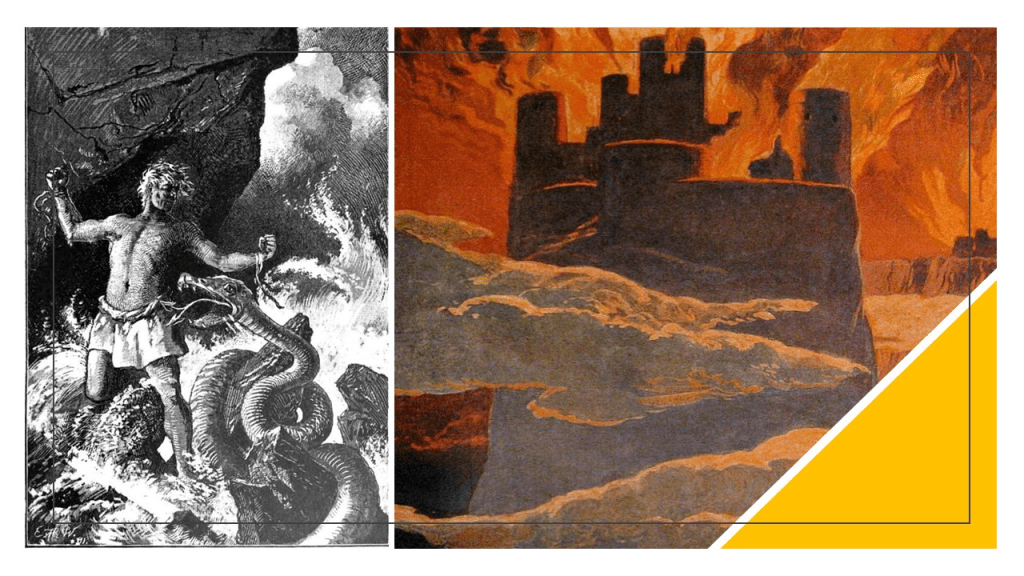 Loki awakes freed and the devastation at the world’s end begins (by Ernst Hermann Walther (1851/1858-1945). – Möbius, Hermine (1897). Deutsche Götter- und Heldensagen. A. Köhler, Leipzig. Between pp. 130 and 131. Digitized version from Google Books., Public Domain, https://en.wikipedia.org/w/index.php?curid=20082669). In the end the whole world and its corrupted ideals (Valhalla) burn (by Emil Doepler – Doepler, Emil. ca. 1905. Walhall, die Götterwelt der Germanen. Martin Oldenbourg, Berlin. Page 57. Photographed and cropped by User:Haukurth., Public Domain, https://commons.wikimedia.org/w/index.php?curid=5208618