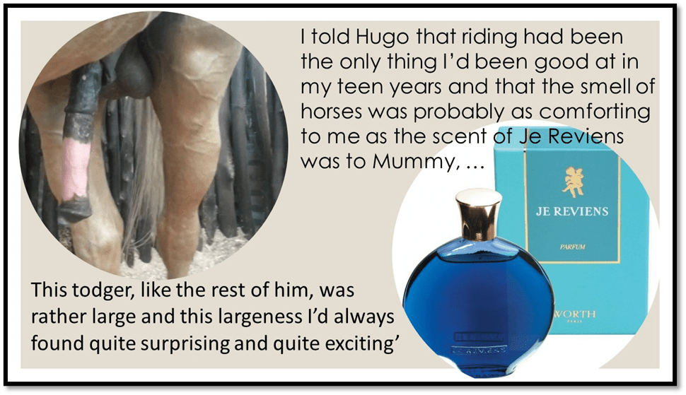 And horses too link complexly with Hugo and become a sexual come-on between them, their scent associated with Je Reviens, Mummy’s favourite perfume. Their essence is that of romantic climax: ‘the fret and the beauty of them and the sense of something colossal about to happen’.[18] It shouldn’t be forgotten that Hugo is to become fascinating too because of the size of his ‘todger’ (his name for it) which ‘like the rest of him, was rather large and this largeness I’d always found quite surprising and quite exciting’.[19]