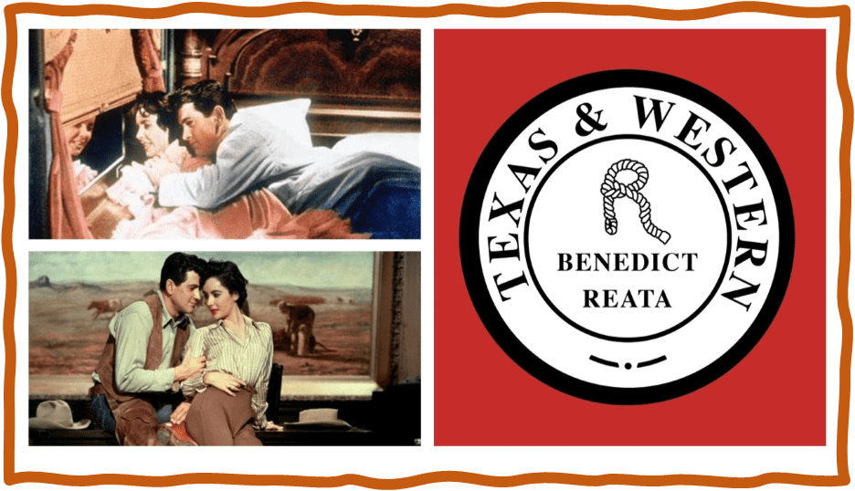 In the pictures of Rachel’s entry into the Benedict Reata brand by train and being beguiled in situ, we see too that women too often felt, or ought to have, in the twentieth century and beyond that the loss of their father’s name to the gain of another man’s name (here Benedict) was also a kind of product re-branding. In the honeymoon suite the couple are looking out of the train window at the dry ranges of the Benedict Reata holdings, whilst in the range, she succumbs to Jordan (Rock Hudson of course) in front of a large landscape painting of the ranch in which, just to the viewer’s left of Elizabeth Taylor, you can see a cow lying in the ranch’s dirt and held forcibly in order to be branded with the Benedict Reata lasso R logo.