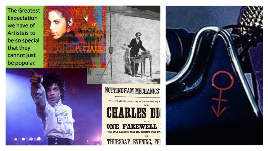 Moreover, as the collage (using my earlier blog) above shows, many artists use logos representing their performance, though they oft vary conventional icons in line with crossing boundaries in describing their own experience as artists or persons. Prince’s particularity was to sell a kind of queer boundary-crossing that could not be labelled medically – as gay, straight or even bisexual – because it was just being absorbed into the potentialities of sexual love uncoupled from reproduction, even though examples of his sexual behaviour seem always to be solely with females. The answer from Prince (and perhaps Dickens if Nick Hornby is correct about the similarity of both artists) is that one must brand multiply and with the chance of instant and continuing metamorphosis of brand. This is not because one is disloyal but because one is guided by an abstract notion of freedom. The label ‘best friend’, for instance, I used in that blog has, for instance, turned out to be a false branding for the person I thus branded has, he has now declared himself, to have ‘ended our friendship’ in the interests of his freedom.