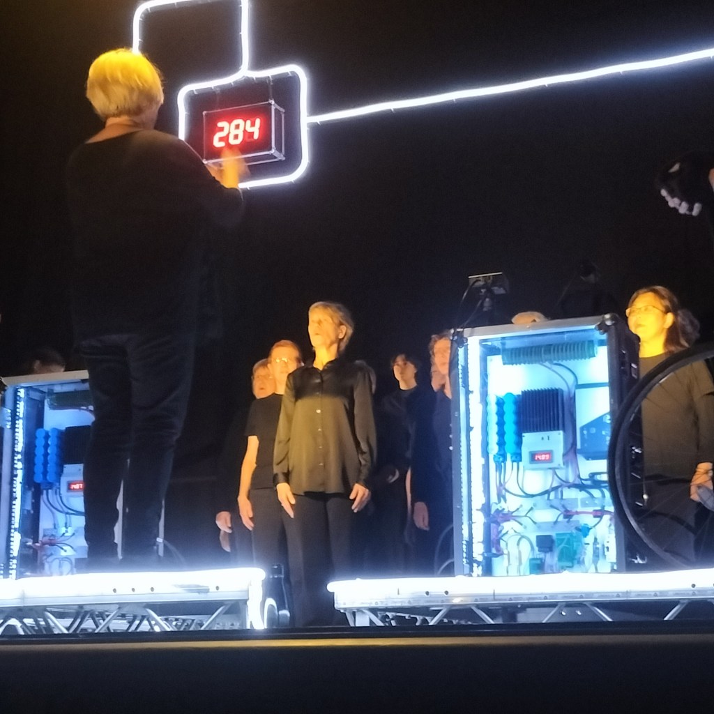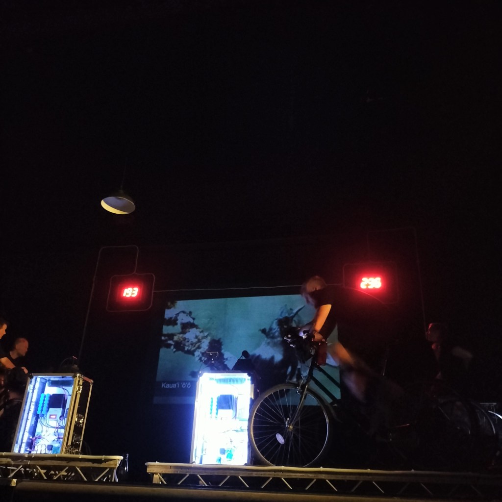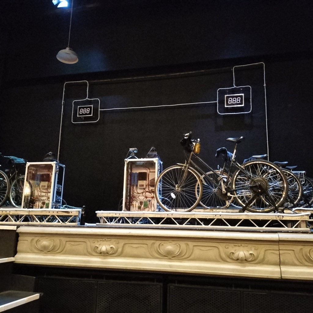 Naomi, the only role in this play despite its huge local cast literally powering the production on bikes which really or in fiction, and no doubt only partially, by generating energy from bikes on the stage, has been left to tell the story of the great Extinctions that have occurred through geological time. We are in the 6th (or was it the 5th) extinction where the rate of species death exceeds even that of the Great Dying in the dawn of pre-human time where 96% of known life forms die.