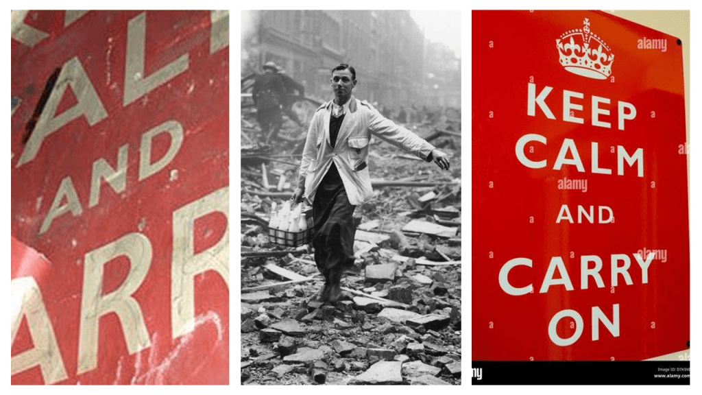 We can just ‘stay calm and carry on‘ as the old saying from the European Second World War advised or try more actively to reshape things, following either or both the forces of our conscious and unconscious motivation. Indeed perhaps ‘staying calm and carrying on’ is itself not the passive thing it seems but an expressed action that maintains the belief and evidence that, in major things, life will continue in its old and established patterns and the status quo of our past lives be vindicated. Indeed the truth about the famous second World War poster carrying this slogan, which had to be pulped (all 42,000 copies though one at least was found in order to be popularised by Barter Books, a famous second-hand bookshop in the old Alnwick Station building in Northumbria) because war-time populations, especially the working-class found it ‘patronising’ and politically suspect. The true story, as told by historian Lucy Worsley for the BBC, can be found on the web here: https://www.bbc.com/reel/video/p09vd955/the-extraordinary-story-behind-britain-s-most-famous-slogan.