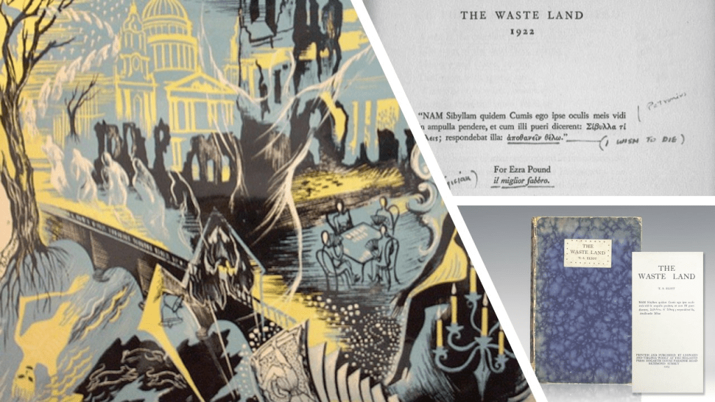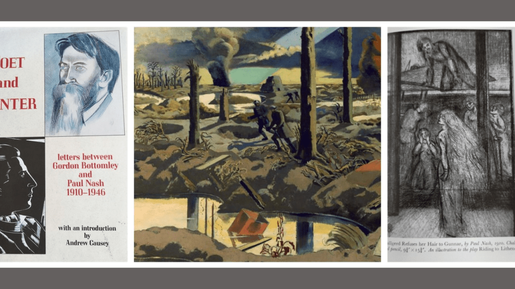 And then there are the actors and the set designers, even location finders and manipulators of location: think of the amazing work – even to the building of a lone mansion done in the Texas scenery of Giant (see my blog here -https://livesteven.com/2023/09/14/as-i-was-reading-mark-griffins-2018-all-that-heaven-allows-a-biography-of-rock-hudson-i-think-i-concluded-that-rock-hudsons-story-and-life-performance-illustrates-that-the-art-of/ ). And what of costume and make-up designers. This is as much more the case in theatre. I am currently reading the letters of a dramatic poet, Gordon Bottomley (forgotten though admired by W.B. Yeats in his day it is claimed by Charles Causey in the book’s introduction) to the Surrealist – modernist English artist, Paul Nash – whose name still causes palpitations (in me at the very least – LOL). Nash’s set designs or realisations of scenes for Bottomley’s plays are now probably rated more by his fans than the plays themselves – like King Lear’s Wife or below The Riding to Lithend – though not considered great in themselves even, unlike Nash’s war painting.