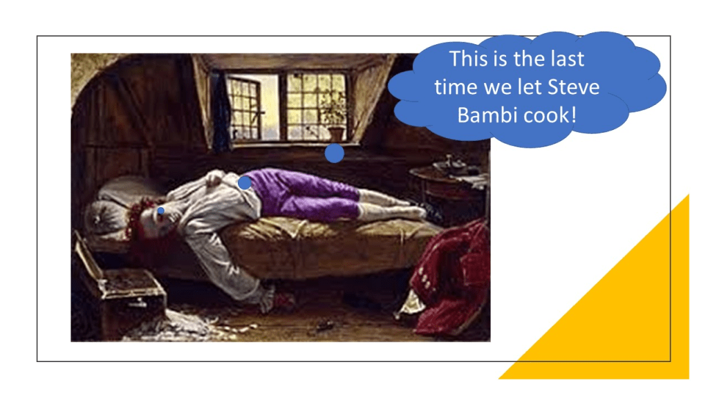 Cooking is an art in which I do not excel. This picture irrelevant to the blog, although this was once my favourite artwork. The joke was devised by my room-mates in the 1970s at university.