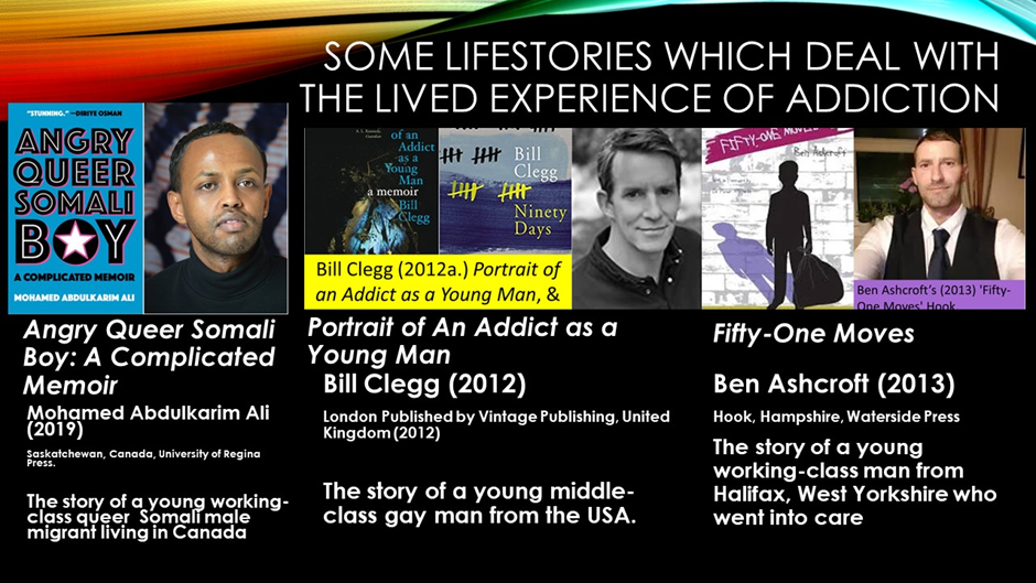 To tell a story about giving up alcohol as a means of embracing life ought to be a humbling experience for the amount of self-congratulation for having made that choice needs the perspective of stories of people for whom this choice was both starker in its origins in their life experiences as for Ben Ashcroft, a working-class care-leaver who seized opportunities to share his stories of a broken care-system and the fragmented lives of alcohol dependency and mental distress in consequence. Likewise the experience of migration, racism and homophobia in the Canadian memoirist, Mohamed Abdulkarim Ali, or the complex path of a man of talent and skill who just got hooked on stimulation outside his own resources and began to lose them all, like Bill Clegg. Their books are illustrated below and my blog on them available from the links on their name in this paragraph.