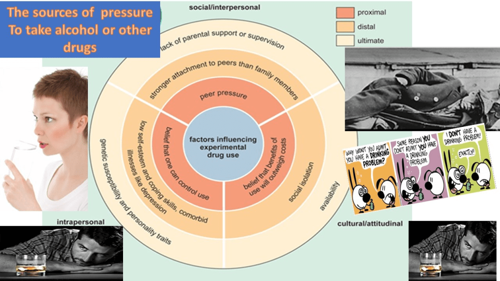 Reading these stories opens one up to the extremes with which substances can begin to represent and displace hopes, fears and turn them into a nightmare with one impoverished object – to remain cut off from all chance of knowing, feeling and even sensing what life might offer. however, in all three cases we miss the point if we see them only as stories about what we call ‘addiction’, for in all cases they are stories where the opportunity to make a choice to live, even in some cases to renounce suicide as an option, is lowered by the capture of the biochemical machinery that is the base level organisation of desire, appetite and perhaps even hope. Alcohol destabilises the role of the forces of ego-strength in the frontal cortex of the brain that mount resistance and inhibition to the easy options for pleasure(even when they are no longer easy but involve, expense, subterfuge and crime to fund that expense and hardship in the form of lost relationships, homes and the good things as well as the shackles of security. The danger of these stories is that they seem to reinforce a common myth of the exceptional nature of the stressors towards alcohol. In fact those pressure whether near to us psychologically (labelled proximal in the chart below), based in social structures outside our immediate circle (distal in the chart, because more distant in their sociopsychological operation) or larger political, economic and social themes (ultimate in the chart).