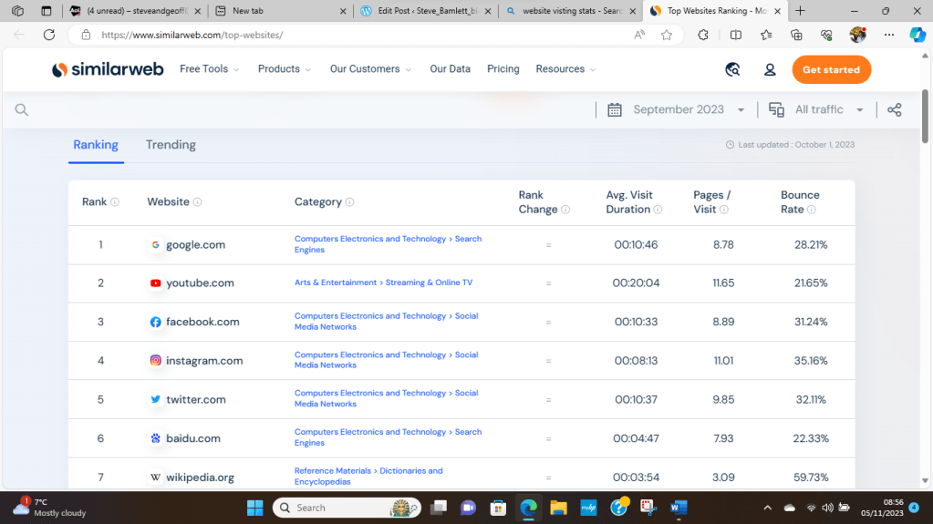 I have not I think found a website which I feel must be addressed with ‘amorous lines’ from me. Nor would I swim the English Channel for one. In that respect I think favouring a website is mainly utilitarian or based on needs that are temporary and pass quickly for most people. In fact, were I mathematically inclined, I might be able to analyse the mass of data the web keeps on itself for it is a reflexive medium. Take the following webpage from the site SIMILARWEB, which adjudges the ranking of favourites using an algorithm that calculates place in relation to statistics measuring variables like ‘average visit duration’, pages seen per visit and ‘bounce rate’ (defined as ‘the percentage of visitors to a particular website who navigate away from the site after viewing only one page’ – https://en.wikipedia.org/wiki/Bounce_rate).