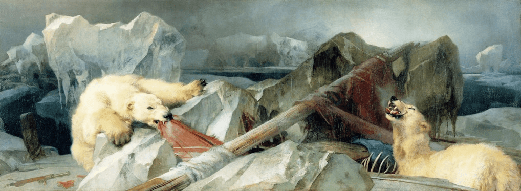 Man Proposes, God Disposes depicts an imagined Arctic scene in the aftermath of Sir John Franklin‘s expedition in 1845 to explore the Northwest Passage but lost in the process. It is by Edwin Landseer – 1864 painting, Public Domain, https://commons.wikimedia.org/w/index.php?curid=9065315