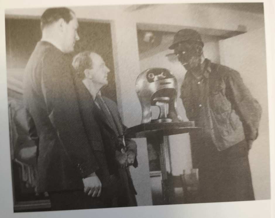 Owen points out that an early study of Moore by Erich Neumann, written from a Jungian psychoanalytic perspective had attributed Moore’s seeming preference for resting, reclining and large female forms to a notion of the archetype of the Eternal feminine associated with a creative underworld of motherly fertility.[8] Male form in contrast, Neumann found I the helmet-head trope, a one eyed hybrid monster that may have its genesis in Homerian and Vergilian Cyclops figures (in Vergil the Cyclops aid the symbolic artist Hephaestus at his forge in the making of cunning art) that is half-machine and owes much to the imagery of Moore’s period – ‘the diving helmet, crash helmet and the gas mask’ – to which Own adds the pit-helmet with its one-eye lamp mid forehead. For Neumann these are ‘death’s head’ figures, so different from creative mothers.[9] They are the fathers however of the late warrior figures of Moore of the late 1950s onwards, in which Neumann found (now making sense of the death’s-head mask period) a manifestation of ‘the most devastating portrayal in all art of a supranatural castration complex’.[10]