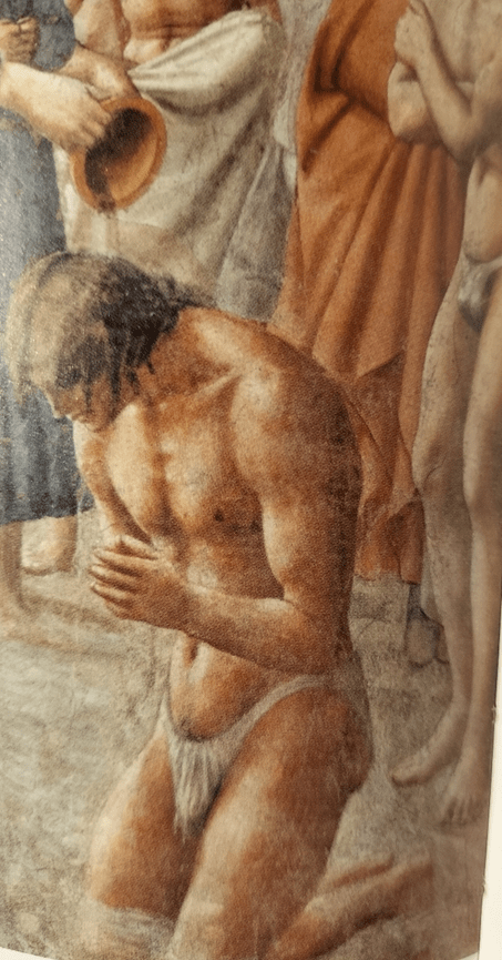 Owen points to the example from Masaccio in 1424-28 of the Baptism of the Neophytes in the Brancacci Chapel, which we know Moore sawing his visit to Italy. Owen describes these as the ‘most powerful studies of the male physique in Italian art’ and the kind of example Moore could be referring to when he used this painter to illustrate what he meant by the humanist approach to the sculpture of human figures.