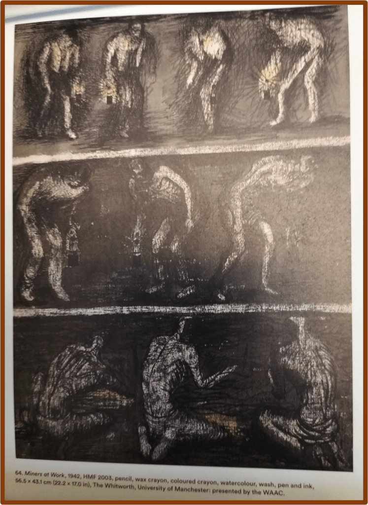 Even if we think this is just a matter of technique that occurred in the revision of the works, Owen’s description of some of the innovative materials and techniques (or both together in the invention of ‘wax resist’) he used shows that, in response to these, his engagement with what these artworks ‘intended’ changed. However, you would have to read Owen’s description of this as I do, with a revisionary sense that Moore saw much more in what he was doing than creating ‘a rough texture and suggested the reflective surface of freshly cut coal’.[24] Decide this for yourself by reading for the book is worth clear and close reading. What I see and feel in the Coalminer Carrying Lamp and more so in the deeply enigmatic Miners Walking into a Tunnel (1942) is something emergent in more than a purely visually realistically representational way – one that does not distinguish in clear ways walking into or out of a tunnel, for what emerges is the relationship of men and man to the void in which masculinity collapses them. Again though I must leave that to you.