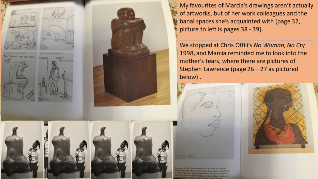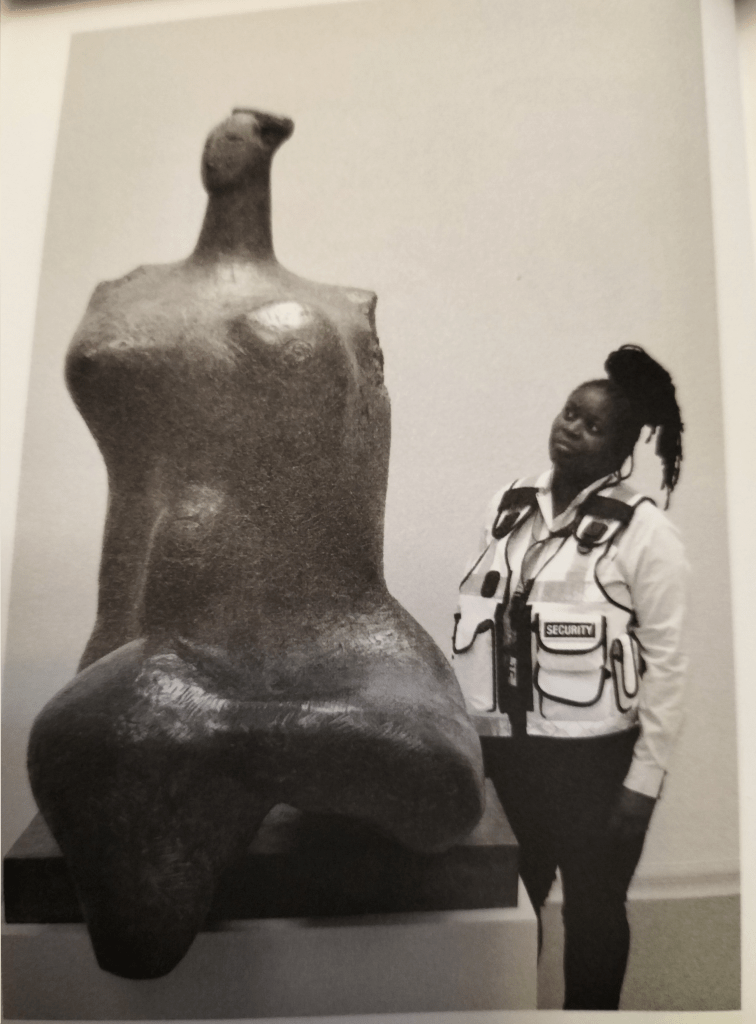Hence the book takes a ‘visual stroll’ of the Tate in London, for Tate Galleries commissioned this book, with a security guard there, Marcia Henderson (who also performs a similar work role at Christies, London, the London art and artifacts auctioneer house, and therefore sees the art world in operation as a commercial enterprise as well as a supposed agent of public service. But Pitts does not ‘use’ Marcia to give a black female perspective on art as is too often supposed to be legitimate, but isn’t. Instead, he listens to her, whatever she chooses to say and how she chooses to illustrate how she arrived at the need to say what she does about the artworks, her own work or life beyond work – for instance her interest in Henry Moore’s Woman 1957-8 is prompted by her attempt to learn the craft of sculpting at an evening class or in the careful way she is trained to look carefully in being a security guard.