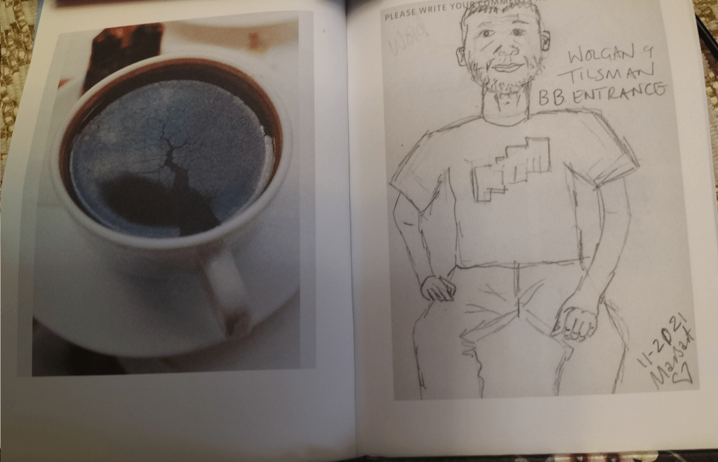 Indeed, we stroll through other works through Marcia’s completed comments, usually in the form of annotated drawings on ‘surplus Tate “What do think?” visitor cards’, which appear in the photograph samples below, together with sights that query where art is to be found – such as the photograph of the two-dimensional fractures shapes apparently on the surface of the coffee in a cup which is Wolfgang Tillman’s chaos cup next to Marcia’s drawing of a colleague guarding it.