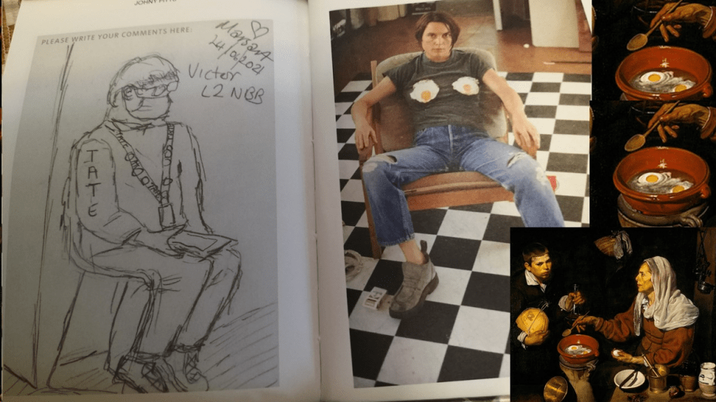 After all, it is certain that Marcia thinks much more than she is prepared to say about all of this, for part of her work role is still to ‘know her place’. Hence many pictures are of people ‘in place’ they have to know and fulfill as scripted by others in charge of them – ultimately a socially alien (in terms of class and race) establishment. For instance Victor appears chained in the regalia of his role in contrast to the deliberate flouting of female convention in Sarah Lucas’ Self Portrait with Fried Eggs, a kind of joke about sexist seeing at the expense of conventional seers of Velázquez’s Old Woman with Fried Eggs.