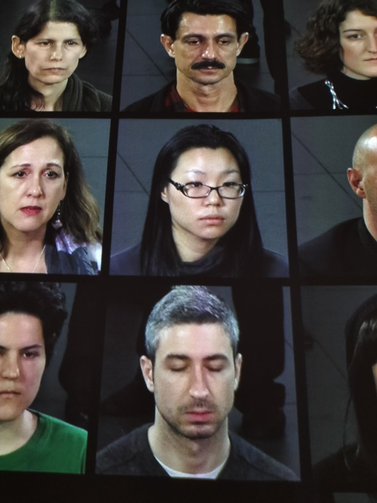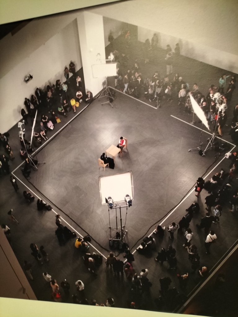 As we enter, there is a bank of screens on the left, each showing the videoed response of one individual to finding themselves, by their own informed consent of course, sitting across from the mute and impassive presence of the artist but for a few reflexive eye blinks. Of course each person saw only the artist within an unenclosed rectangular space except for a marked white line regulating the audience from spilling into that space, with a gap indicating where participants entered the space as we see above.