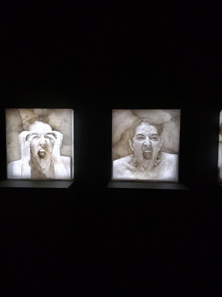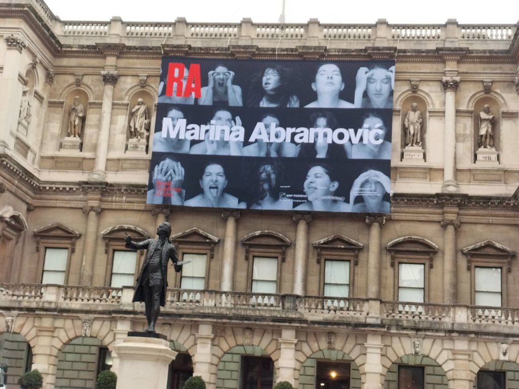 But perhaps if my energy has been underwhelming, please see it if you can for it fascinates conceptually..and for another reason, Going through the portal of the Royal Academy it is wonderful to see the niches male worthies on the top frontage of that August patriarchal building, and even the statue of a hero like Turner. It is wonderful because they seem disrupted by Marina’s angry face versions amidst them on the frontage. Let this only be a beginning and not just in modern performance and / or conceptual art.