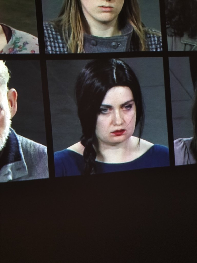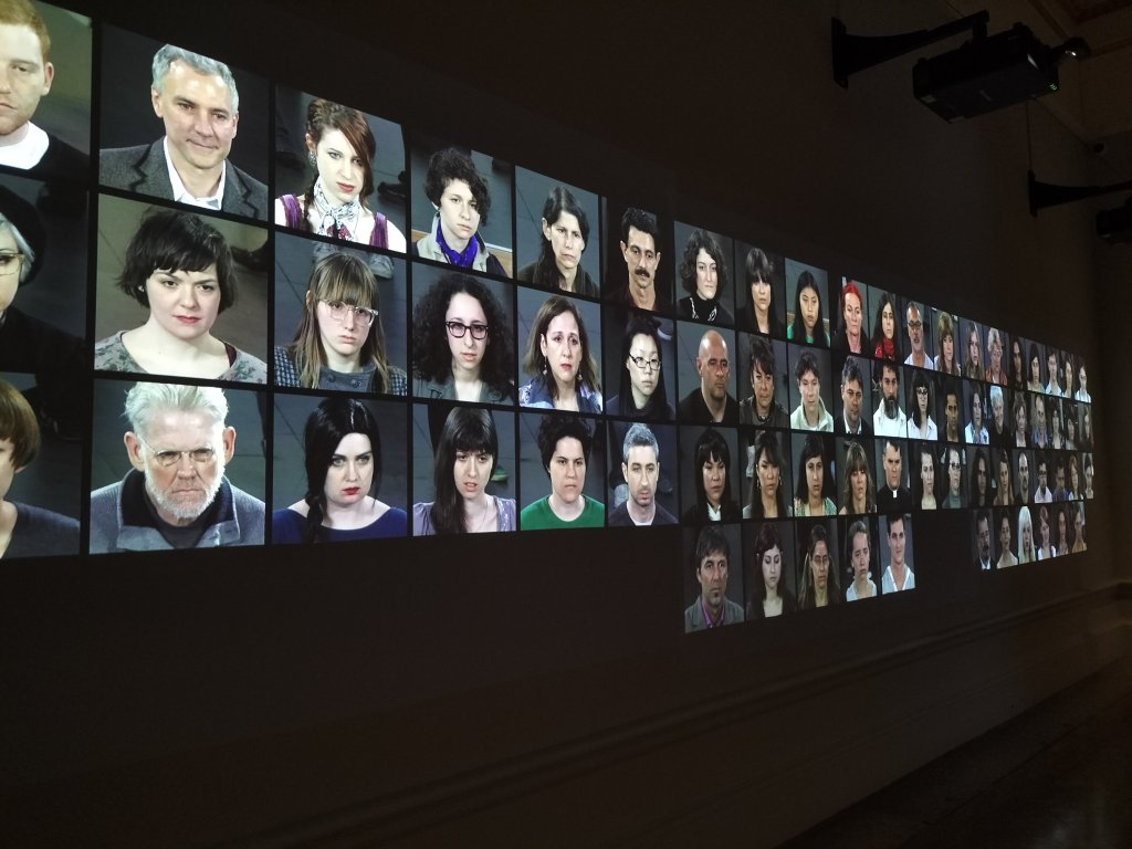 Across the room the face of the artist on an equal number of screens ‘faces off’ each of those individuals. However, because the occasions were necessarily over a long period with breaks for the artist, she sometimes wears a differently coloured dress. Those breaks are made to look largely if not totally regular, on the whole with clear dividing lines.