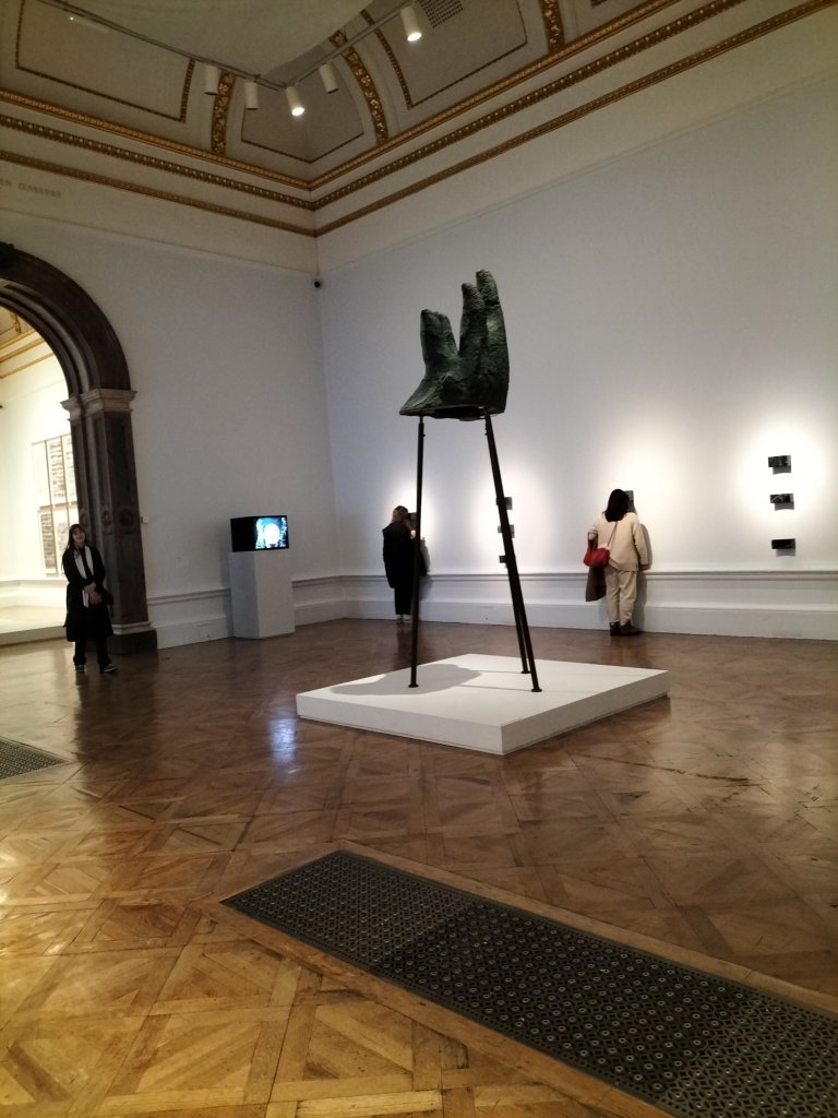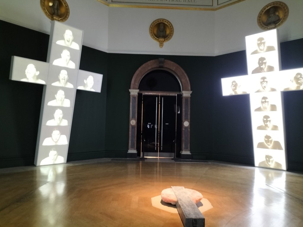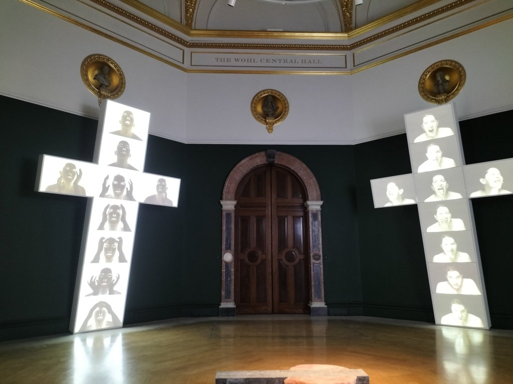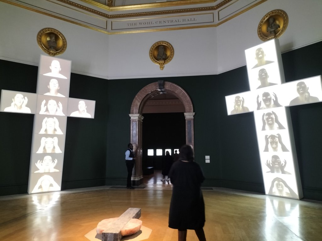 In what follows the Four Crosses were equally impressive seen because of their size and effect in the huge rooms given them in the Royal Academy with its wondrous overwrought doors. In one of my photographs I inadvertently captured a nun seeing those pieces, who was happy to remain in the shot.