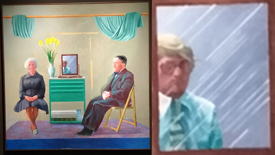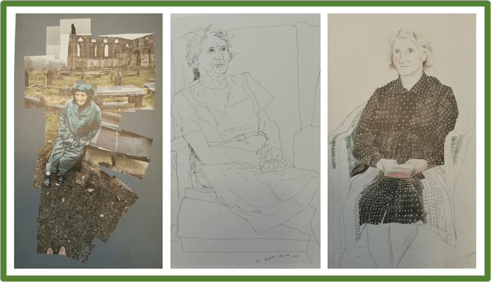 Time as a factor in the representation of a relationship with a sitter comes into its own when we turn to the main interest of this exhibition and its catalogue – the use of the same sitter over the duration and mutations of that relationship, where the effects of aging in artist and sitter must be negotiated. No-one was better at this, in Hockney’s view than his mother Laura, for she was a ‘good sitter’ as I have already recorded in speaking of Hockney’s conversation with Howgate. A good sitter is sufficiently still to allow the relationship of artist and model to be expressed. And it is Laura’s stillness and the constancy of her dedication to her son’s artistic experiment that speaks through many portraits, even when Laura herself must have found even sitting still more arduous than it had been, especially for a plethora of photographs on a rainy November day in 1982 at Bolton Abbey (where putting up with discomfort shows) that Hockney needed to create a ‘chromogenic print photocollage’ (the image on the left in my college below).