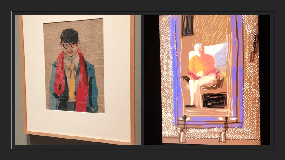 These meanings become richer if we compare these persons as ‘sitters’ in a quite literal sense. Dad’s thoughts are elsewhere – he is ready to rise and go. Hockney told Howgate that whilst his mother ‘was a good sitter’: ‘My father wasn’t, he couldn’t sit still for that long …’.[7] Of course, I won’t convince many but this painting is really for me about how the painter paints the time of his coming, as artist and stylistic master, through relationships with significant others in which he is embedded. But move on, we must. For time waits for no artist who is reluctant to master those implements that make beautiful marks on a beautiful surface, real or virtual (in the case of the later iPad works, and this innovative way of representing himself as a way of moving with the times is typical of Hockney. Thus below see him doing this in a 1954 (my birth-year) self-portrait made of collage on newsprint – a fine way of evoking significant time – or one that shows himself in a picture capturing the mirror that reflects himself capturing his image on the iPad he hols in his hands (and that of the mirror to ensure the reflective mimesis of the mirror and reflexive awareness enabled by art are compared as they must be in art).[8]