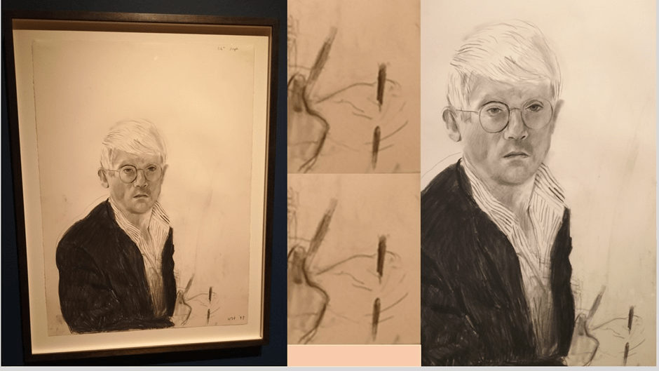 And this self-portrait is not the first instance of where the nature of the marks making the picture inscribes the artist’s reflexive emotion as the true driver of perspective and depth in a picture. Hockney’s battle against the primacy of camera images as a two-dimensional ‘record’ of what is seen by the eye made him see why drawing mattered, allowing depth of different kinds to be sensed anywhere in the body. No surface after all can be without depth and the gradations of being in between them which style recreates. This is so not just in making images but in playful experimentation in capturing the sensed, just as no precision of detail can be achieved by an artist without the reminder that they best inscribe detail by allowing it to spring literally from the ‘sketchy’, like those sketchy hands caught in the hand of sketching with a charcoal stick made from that very charcoal. the same is see in the handling of Gregory’s penis in a famous nude drawing of that lover that I will instance later. No picture I know is closer than this to describing how the art of observation comes from a profound love of embodied selves, and their relationships to each other, and that no self-portrait works that does not create the viewer too, and their relationship to the image-maker, as a highly significant other.
